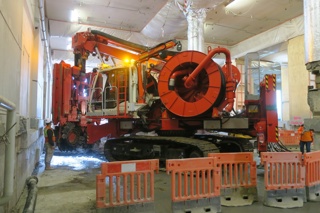 The bright red 90 tonne piling rig named Sandrine that has been working around Britomart Transport Centre has just finished her journey.