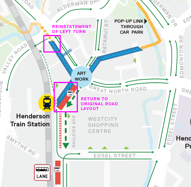 The original road layout will be reinstated along Railside Avenue near Great North Road, and the left turn lane from Great North Road onto Henderson Valley Road will be reopened.