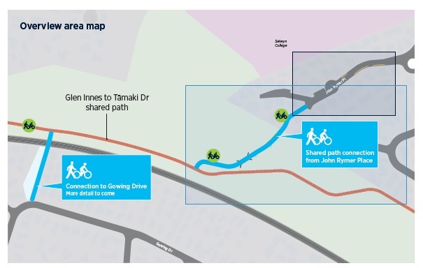 The project includes two shared path connections - a northern connection joining John Rymer Place with the Glen Innes to Tamaki Drive Shared Path, and a southern connection that joins Gowing Drive with the Glen Innes to Tamaki Drive Shared Path.