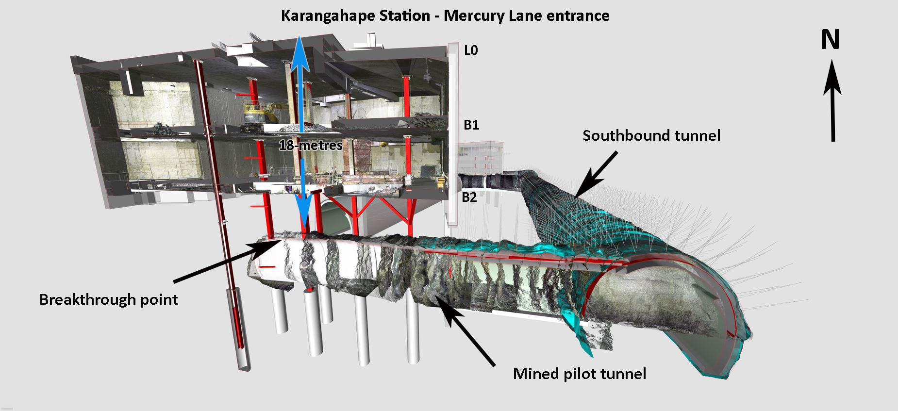 The breakthrough occurred 18 metres below the station entrance under construction at Mercury Lane – the building is now connected directly to the mined tunnel excavations underway for Karangahape’s platforms.
