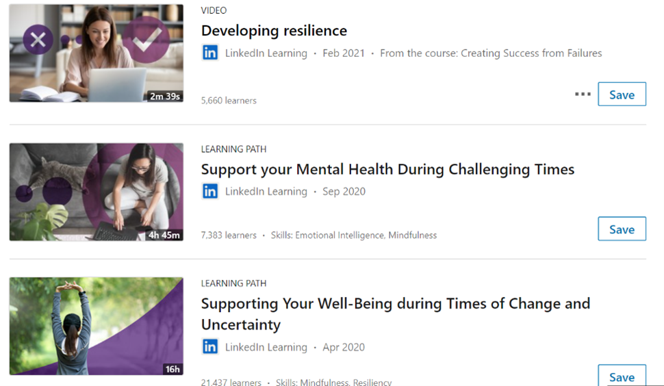 Once you’re signed up, you can also access the Libraries’ LinkedIn Learning page for over 16,000 free eLearning video courses and tutorials. Simply search ‘resilience’ for a selection of resilience-based resources. Here’s a snapshot of what you can find: