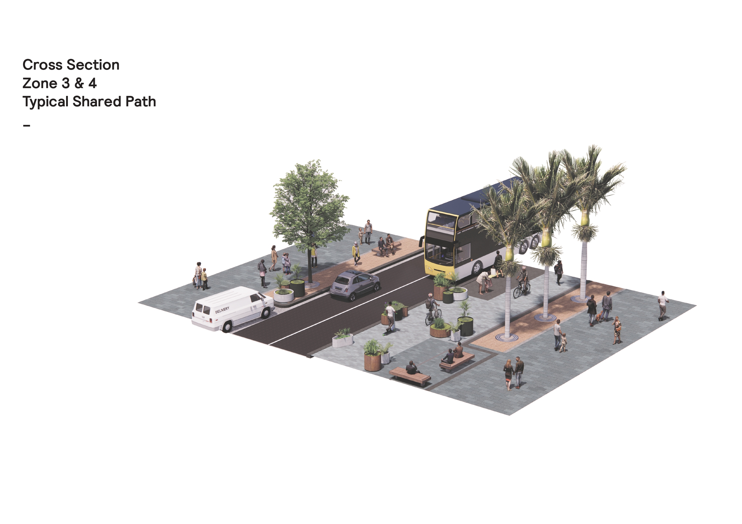 The main feature of the design is substantially wider footpaths, giving all people on foot and on wheels designated spaces to ensure they co-exist safely.