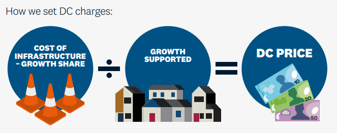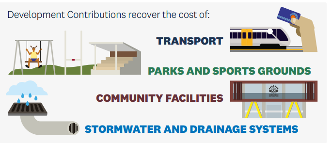 Development contributions recover the share of costs caused by, or that will benefit from, development. If this share of the costs isn’t met by developers it will need to be funded by ratepayers or taxpayers.
