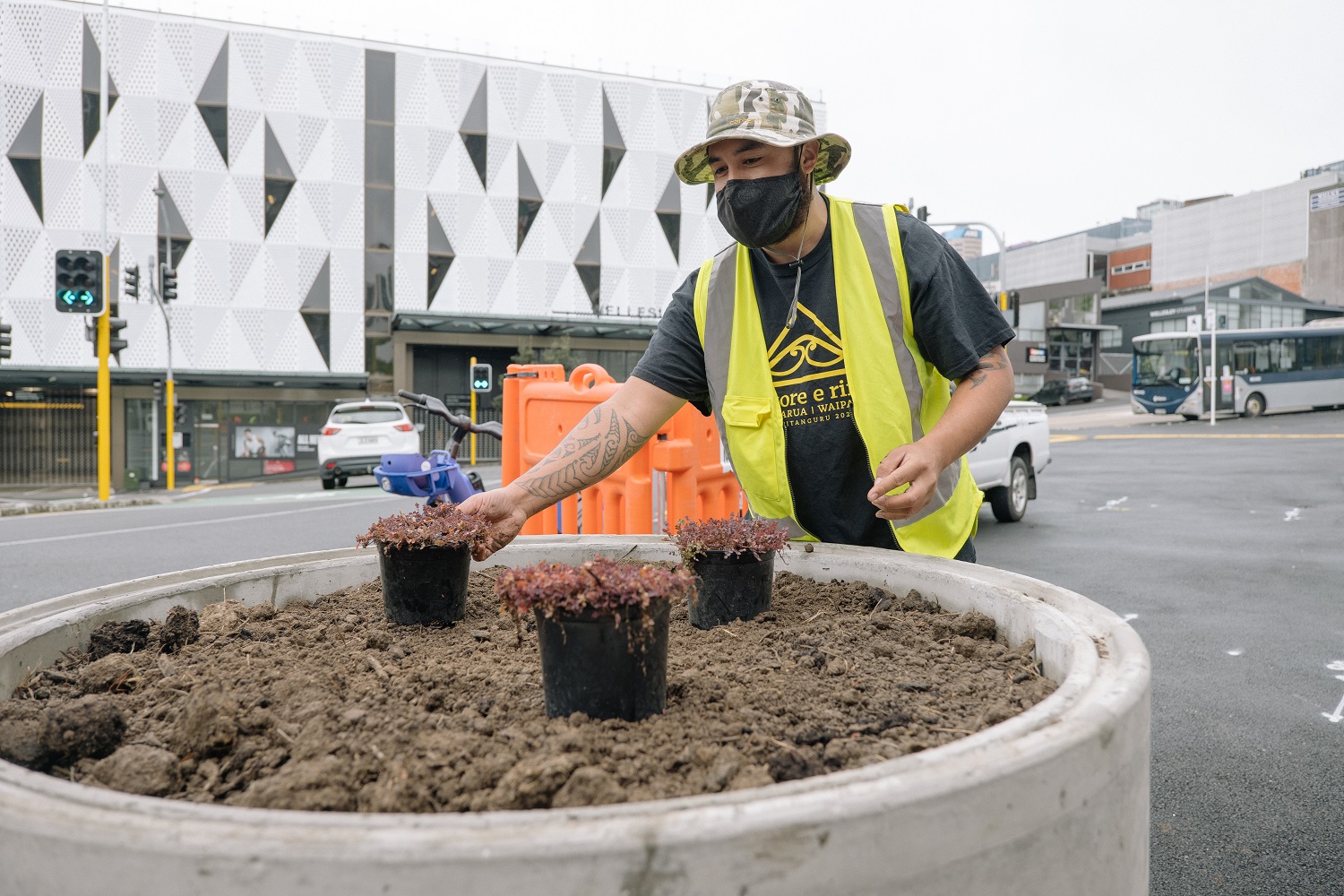 The three young men who have delivered this work, alongside the Te Kaunihera project team and under the guidance of Māori landscape architect Alan Titchener (Kai Tahu), are: Jyde Tamaariki (Ngāti Whātua Ōrākei), kaitiaki rakau; Etienne Neho (Ngāti Whātua Ōrākei), kaitiaki rakau; and Kahurangi Eruera (Te Tai Tokerau/Te Tairāwhiti), council’s Māori Design intern currently studying his Master of Architecture.