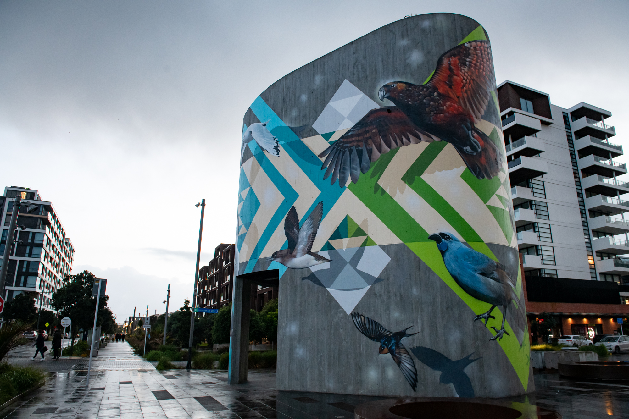 As the trees planted at Wynyard Quarter flourish and birds return, it’s fitting to see a beautiful new mural adorning the award-winning pump station at Amey Daldy Park, celebrating our native manu (birds).