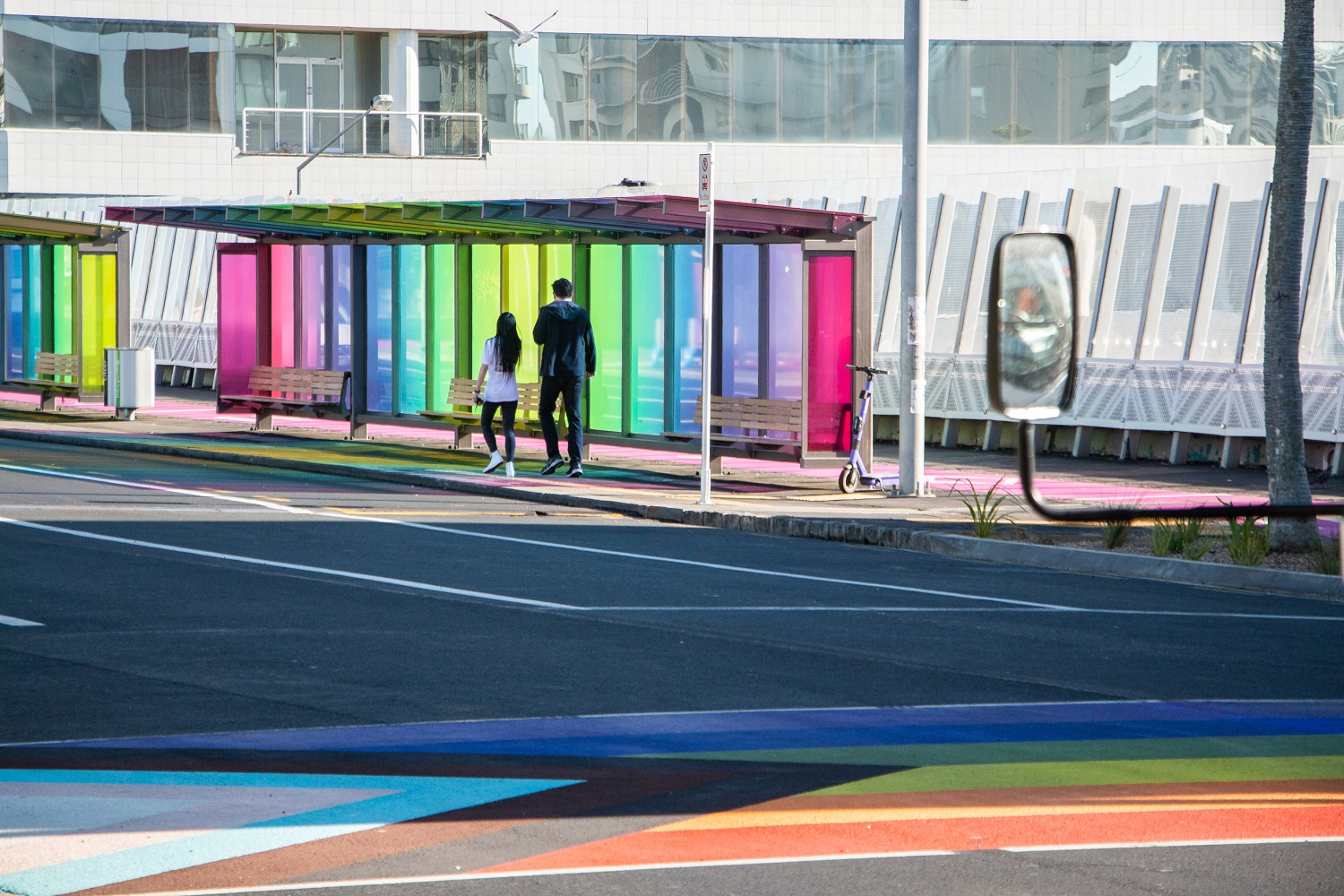 These are much more than bus shelters. Enjoy the layers of colour. They symbolise the pāua shell eyes of Māori carvings reimagined into a material adorning the structures.