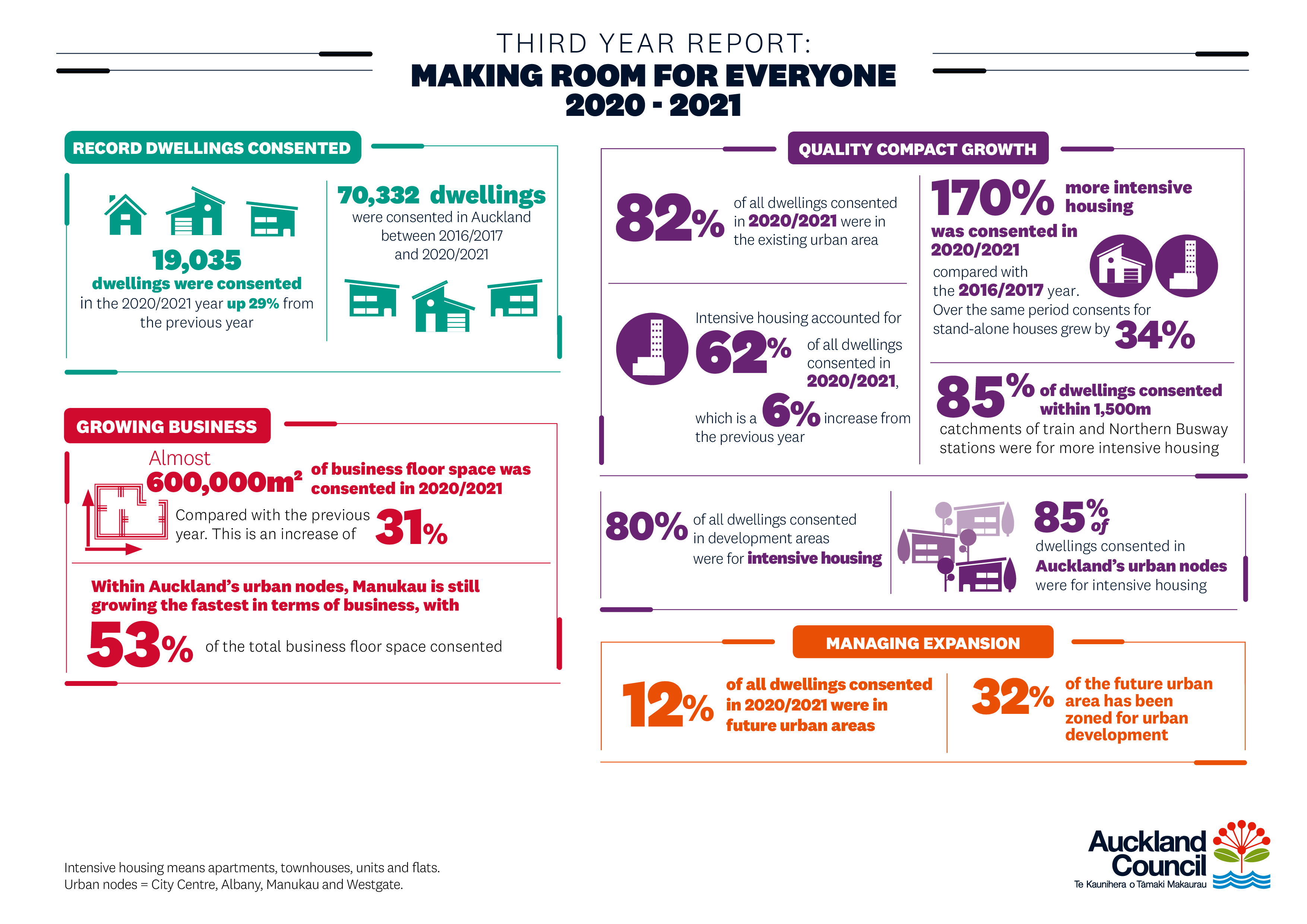 The report reveals that housing consents remain on the rise in Auckland, total dwellings consented increased by almost 30 per cent compared with the previous reporting year. 82 per cent of those consents were issued in the existing urban area, and 62 per cent of total consents were for intensive housing - apartments, townhouses, units and flats.
