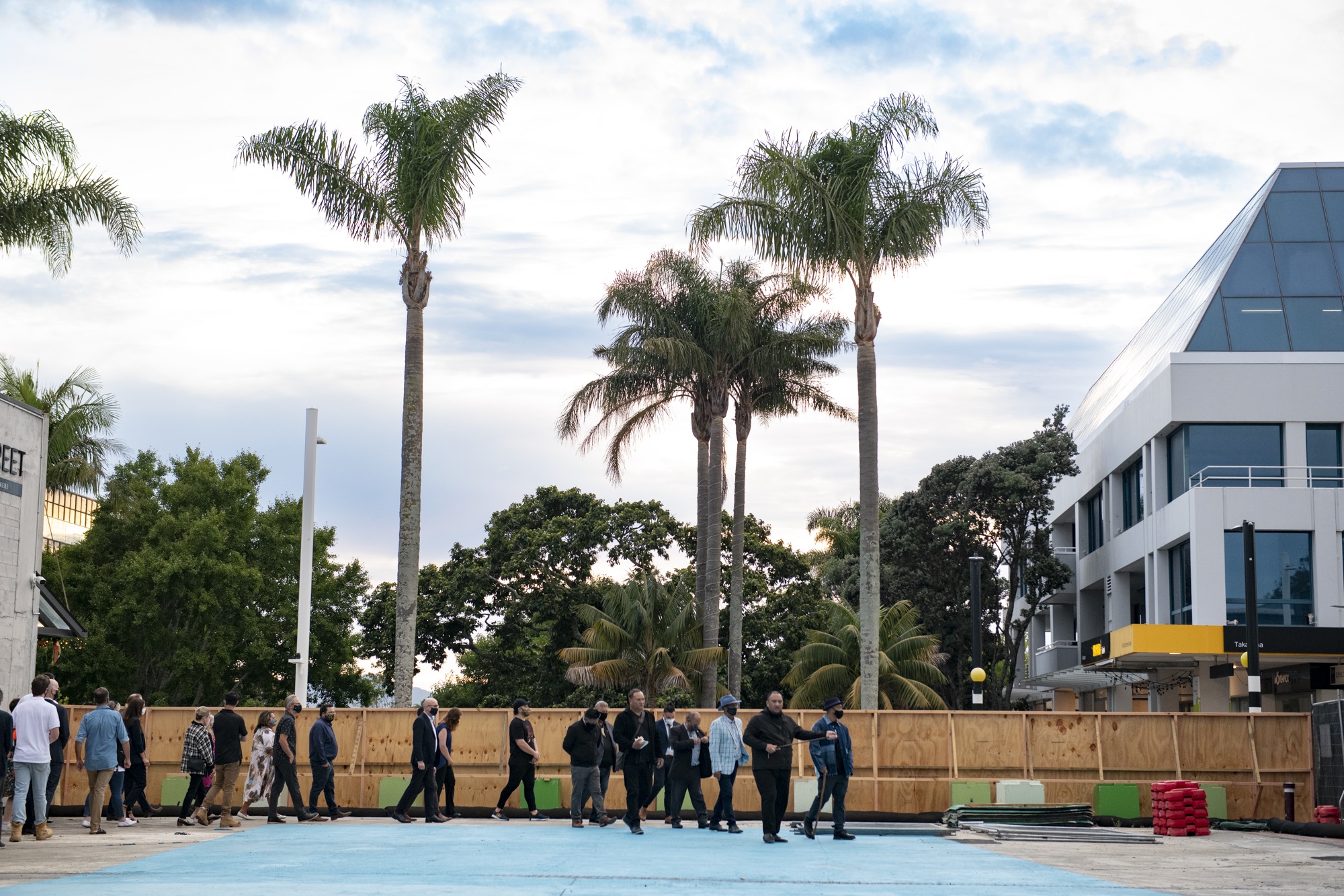 A karakia whakawātea (blessing ceremony) was attended by members involved with the project. The group gathered just before dawn, joining a procession around the site led by mana whenua reciting a karakia (blessing) to cleanse the future site of Waiwharariki Anzac Square.
