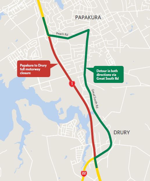 The Southern Motorway will be closed between Papakura and Drury from 7pm Saturday 21 May to 9am Sunday 22 May to demolish the Park Estate Road bridge.
