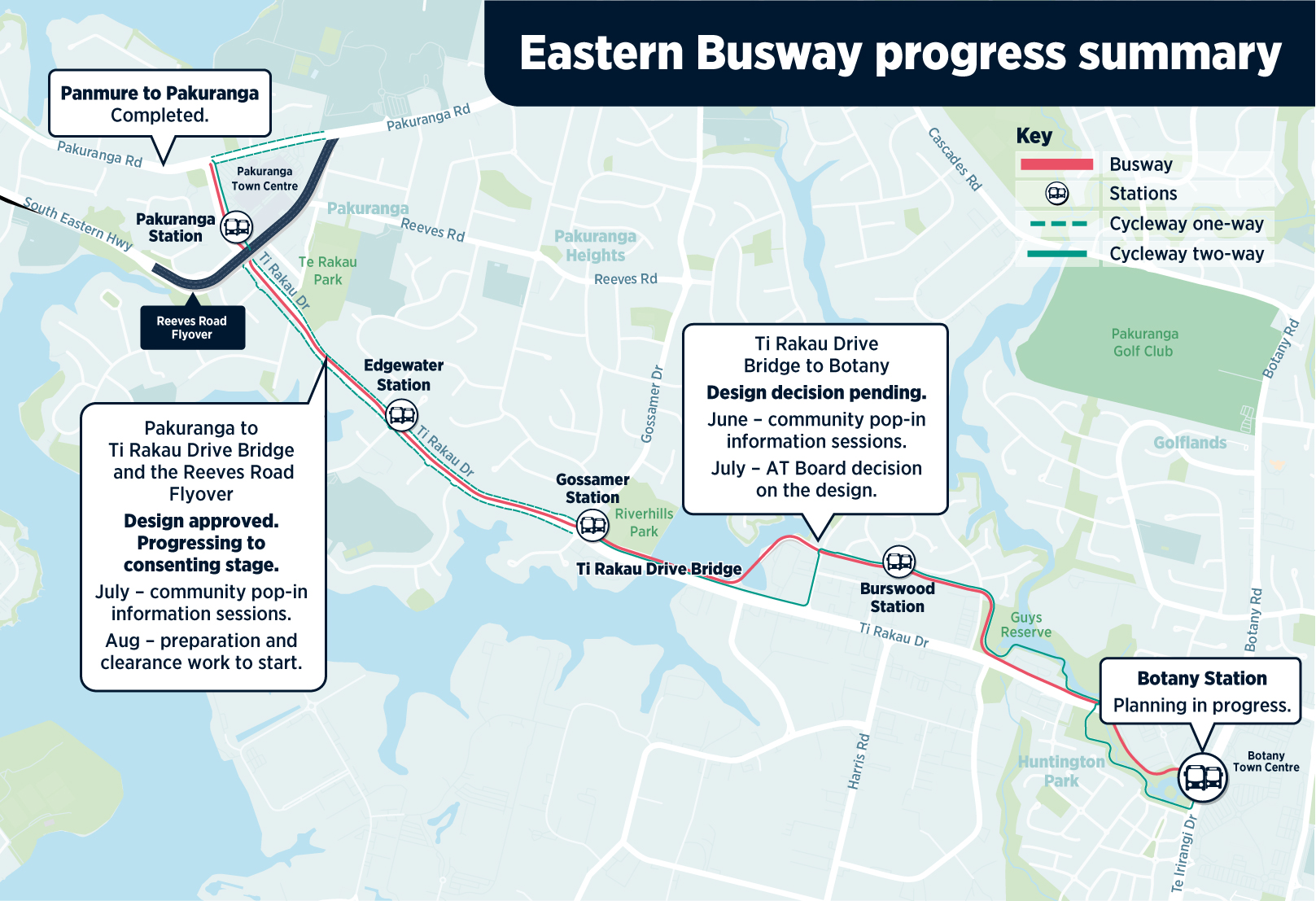 Following their decision in February, in May 2022 AT considered the route options between TI Rakau Drive Bridge and Botany Town Centre and would like further time to engage with the community before deciding the route. AT’s decision on this section of the alignment will be known at the beginning of July.
