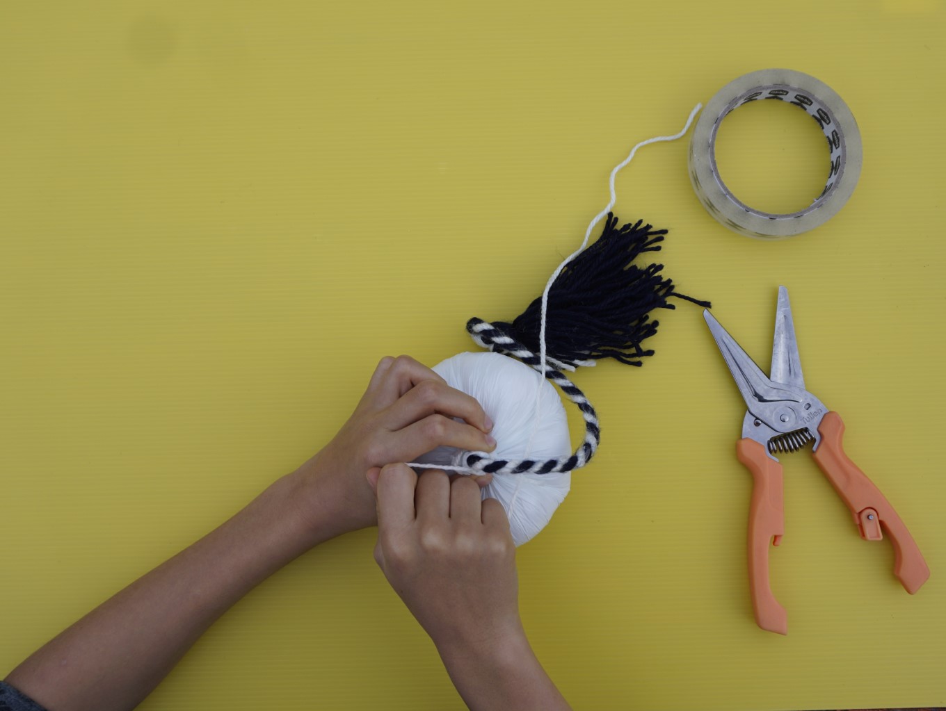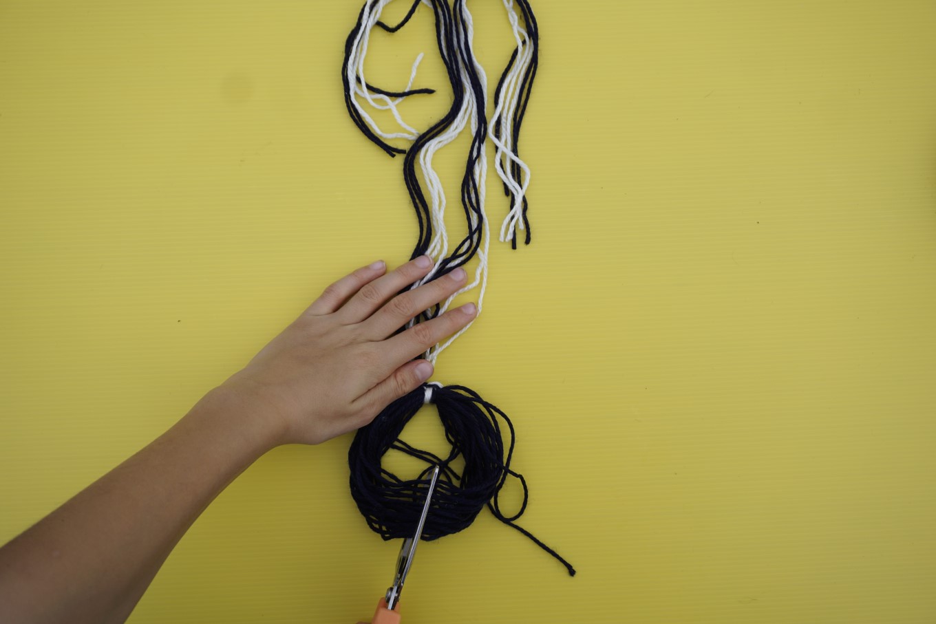 Tie a knot around the circle with your nine lengths of wool, then use a loose piece of wool to tie another knot above the first knot to secure your tassel and cord in place. Use your scissors to cut through the bottom of the loop. Now you have a tassel.