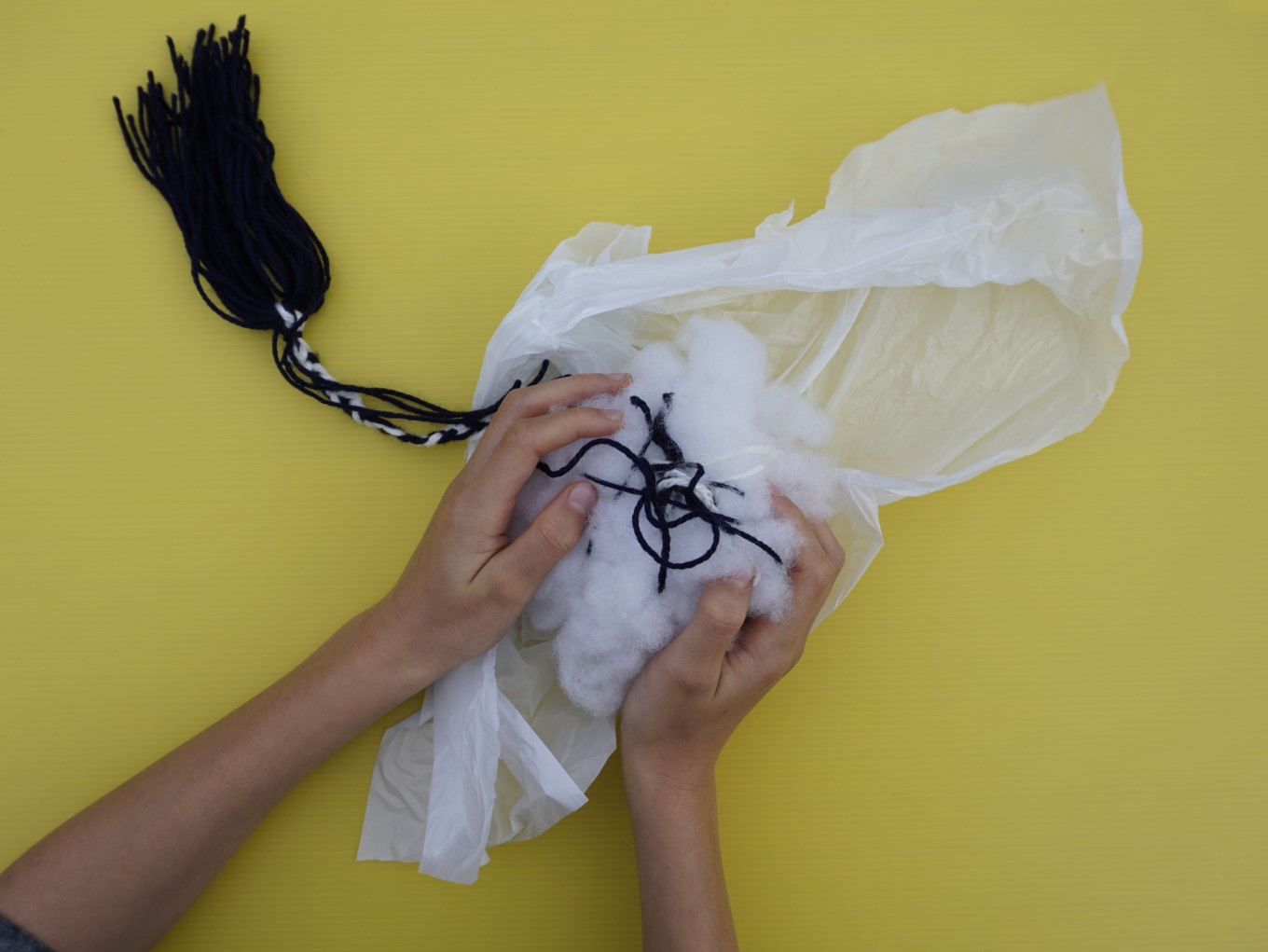 To make the upoko (head), cut out a piece of plastic and lay it out flat. Shape the cotton wool into a ball and place it on top of the plastic. Tie the loose ends of your plaited cord around the wool.