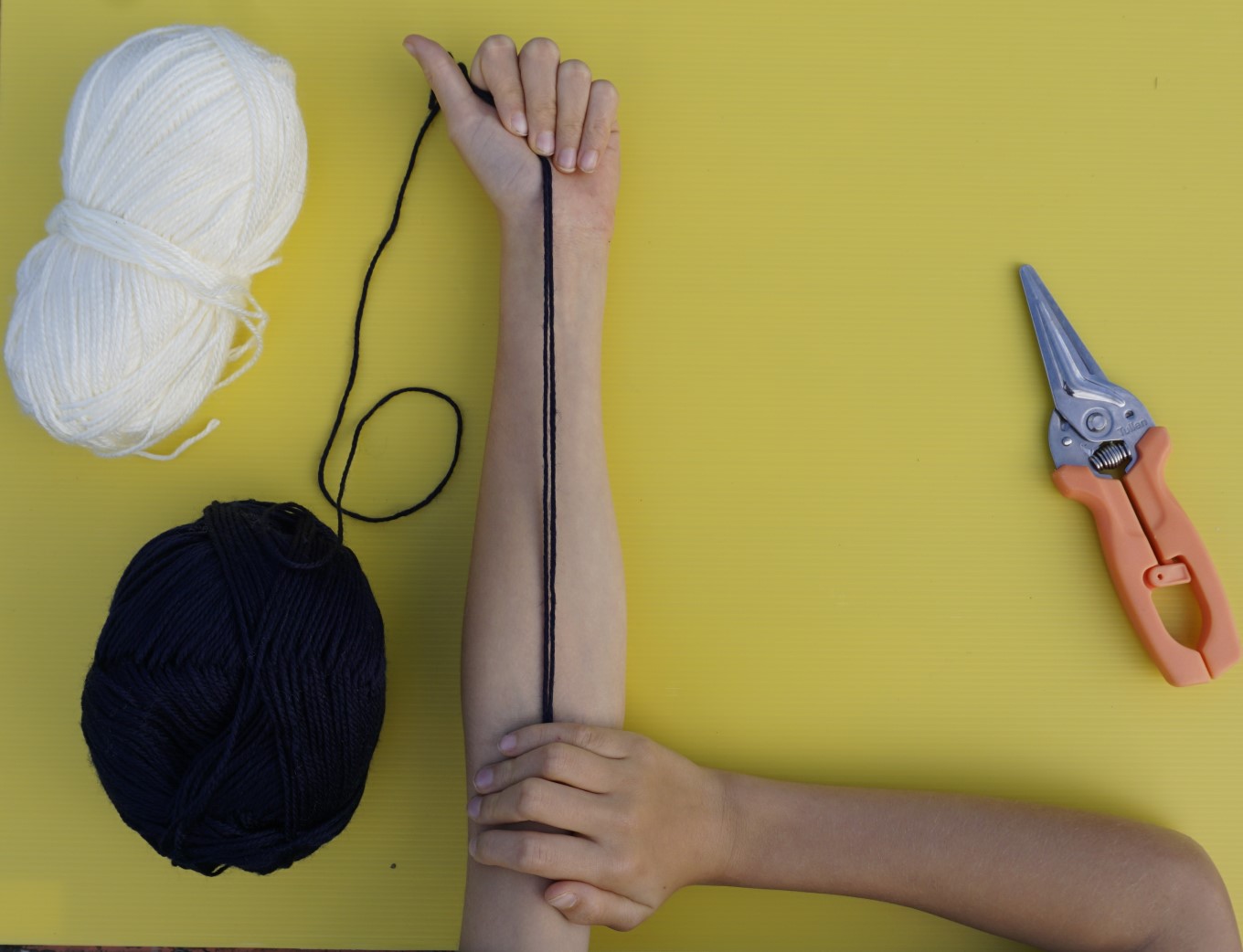 Start off by measuring out nine lengths of wool for the taura (cord). If you’re using more than one colour, you might create five lengths of one colour and four lengths of the other or use three colours and measure out three of each. For a long poi, measure a length of wool that stretches from your index finger to your elbow and back. For a short poi, it only needs to measure to your elbow. Set your nine lengths of wool to the side.