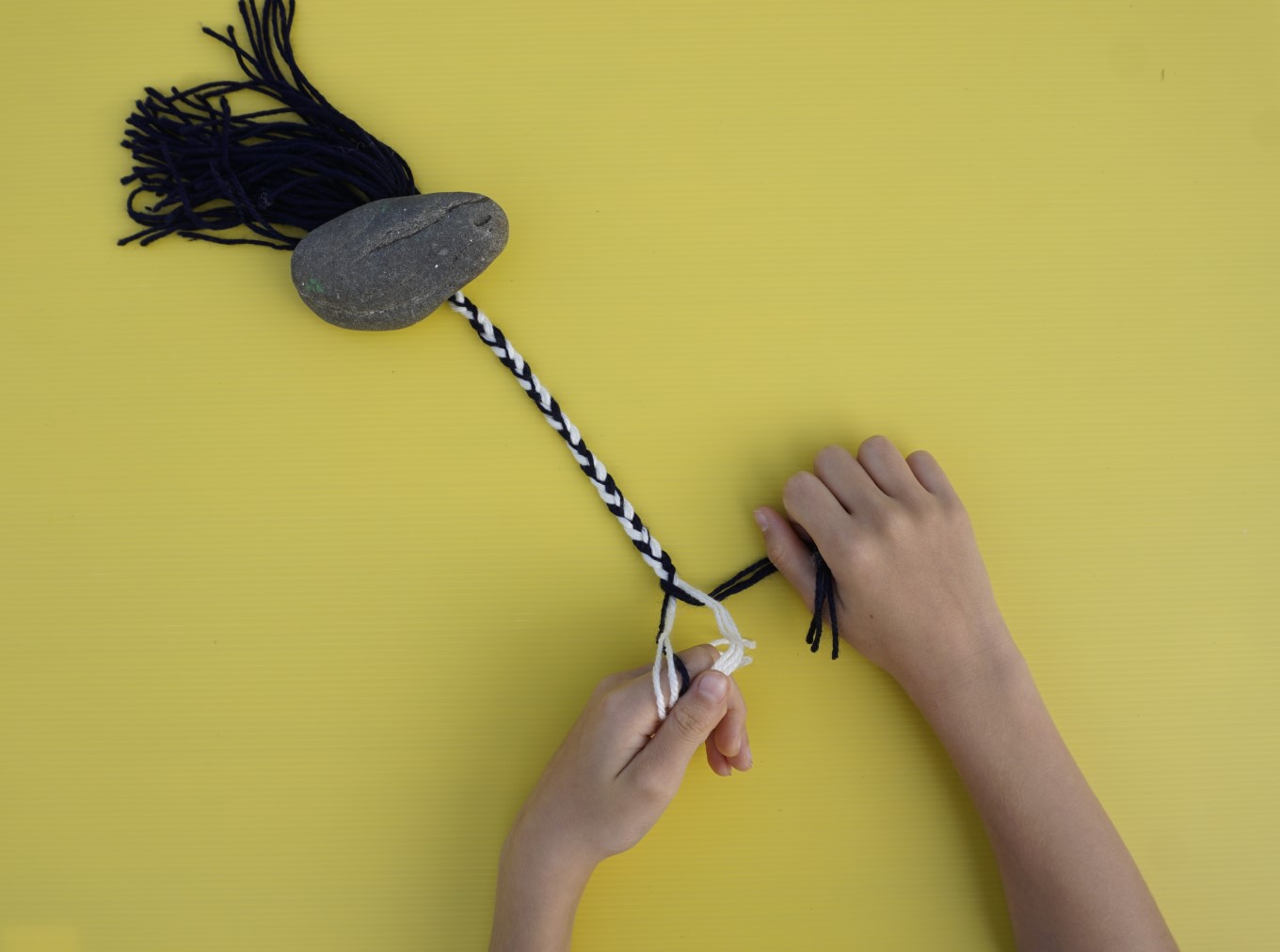 Place an object like a rock on the tassel end of your poi, then divide your wool into three groups with three strands of wool each. Plait them together, leaving some around 10cm loose at the end.