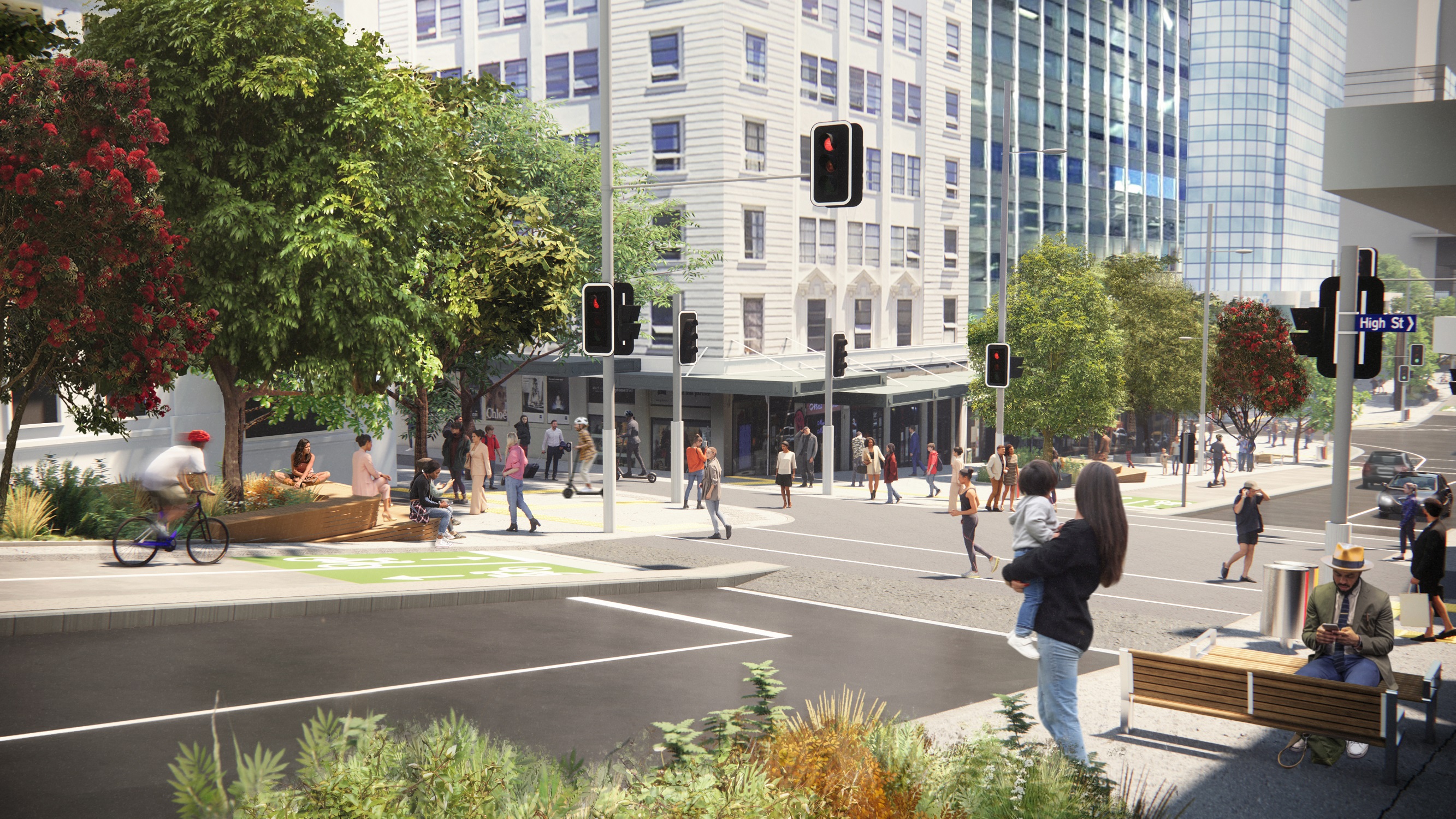 Victoria Street is set to become a tree-lined, pedestrian-prioritised street with the delivery of Te Hā Noa. The design of the street will provide one lane of vehicles in each direction, connected laneways, wide footpaths with places to sit and spend time, street furniture, public art and a protected cycleway.