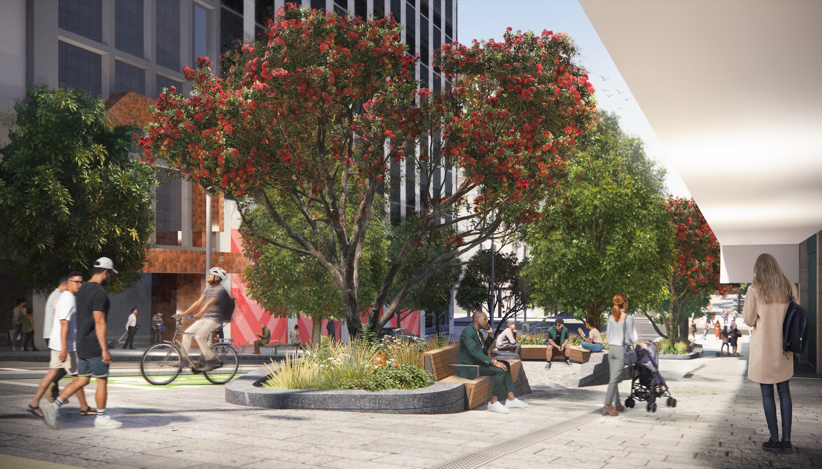 More than 20 native trees will be planted along these sections of Te Hā Noa, adding to the city centre’s expanding urban ngāhere (forest), providing shade and shelter, cooling the city and soaking up carbon.