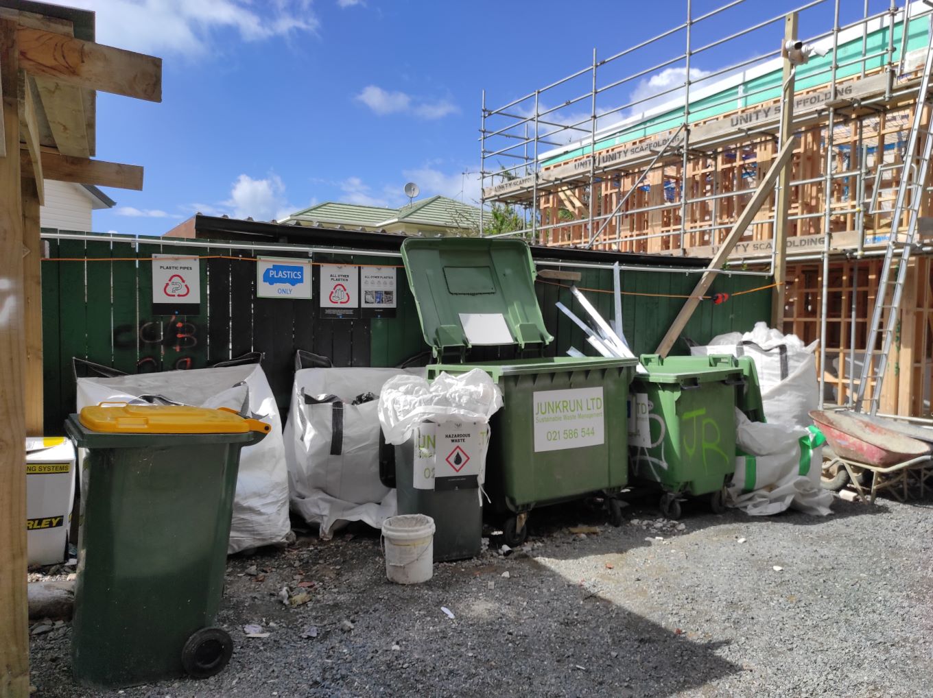ESRC managed the plastic waste and hazardous waste. Plastics were sorted into pipes, polystyrene, and all other plastics. Junk Run collected and managed timber, cardboard, and 'builder's waste' (mostly construction materials), scrap metal, fence palings and posts, paper, and sweepings.