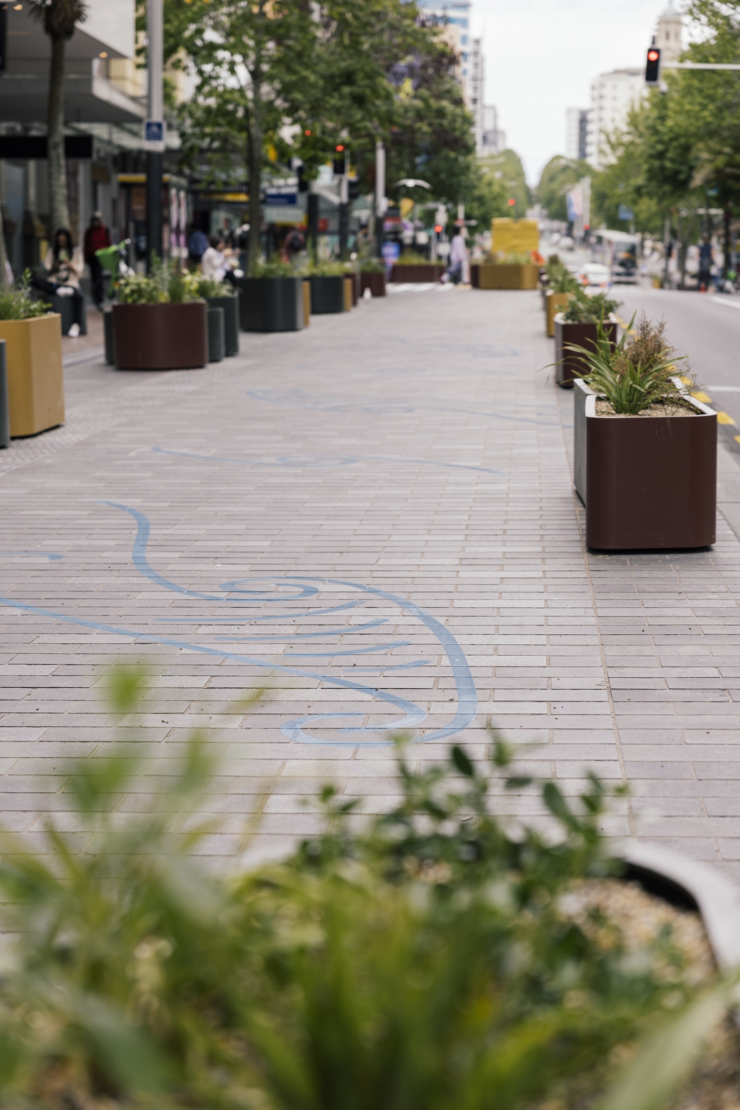 Auckland Council, in collaboration with Auckland Transport and mana whenua, has converted traffic lanes into expanded space for people walking or on wheels, dotted with over 200 planters filled with native foliage and more seating for people to use while waiting for the bus or enjoying their lunch.