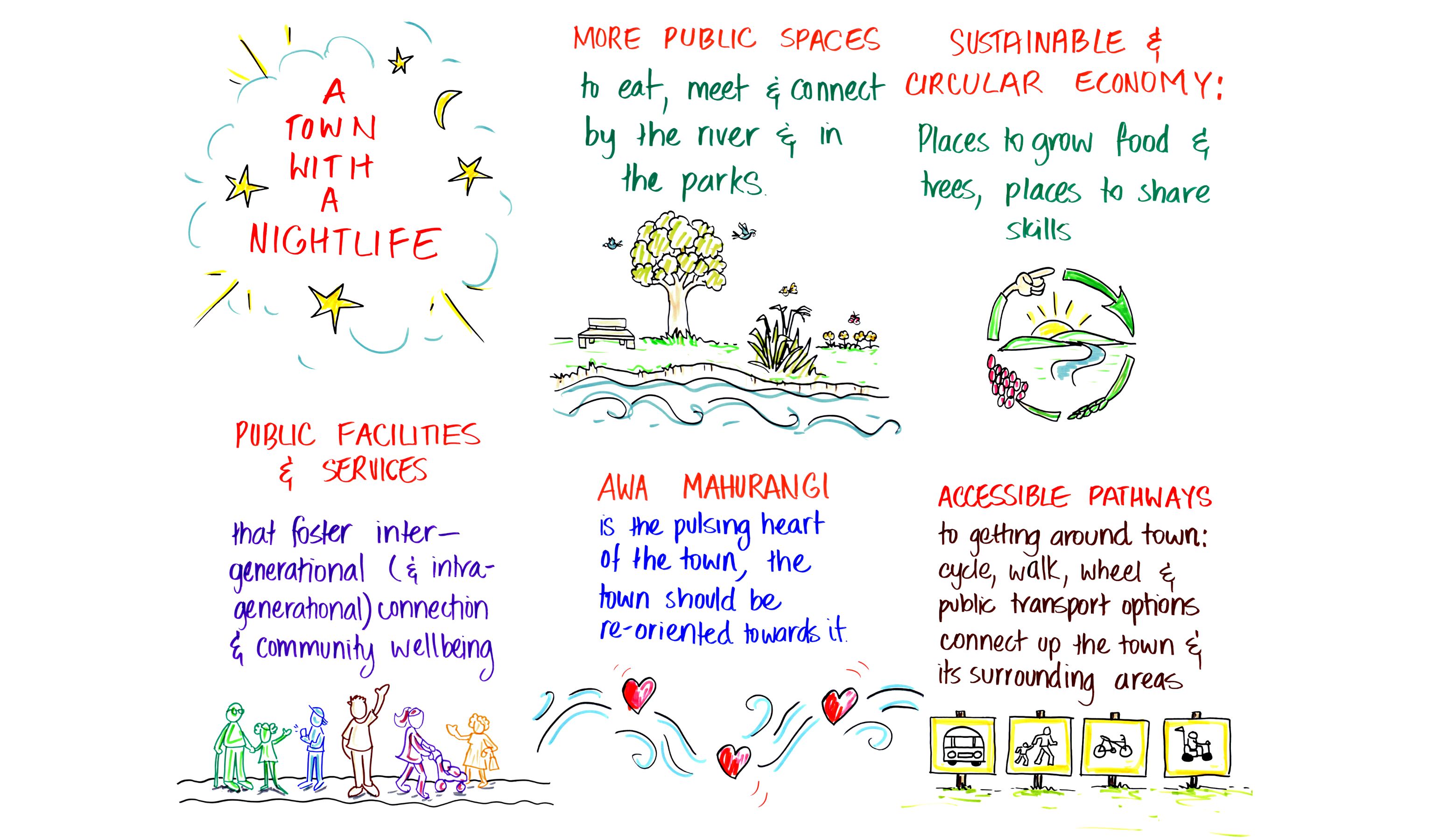 “Residents have talked about a sustainable vision and a local economy that supports locals and visitors alike. Other suggestions have been to activate more spaces around town and by the river, and for lanes and paths that connect the town, river and green spaces.”