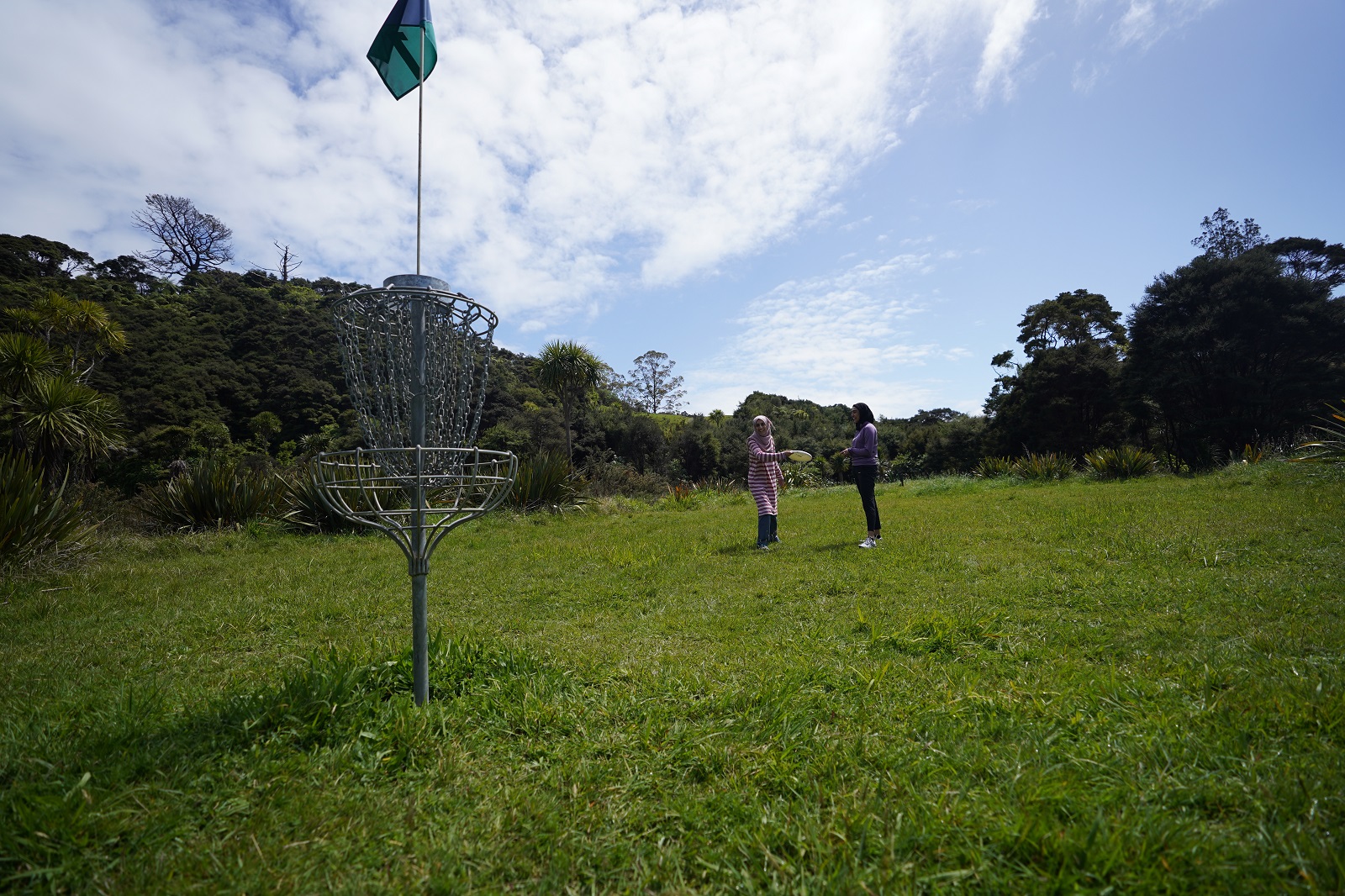 Make a full weekend of it and stay at Pae o te Rangi campground near the edge of the regional park. A 20-minute walk south from the disc golf course, you can pitch your tent in a fenced grassy space surrounded by a working farm with fantastic northern views of the Waitākere Ranges. The hills surrounding the campground stop the light pollution providing great starry views at night.