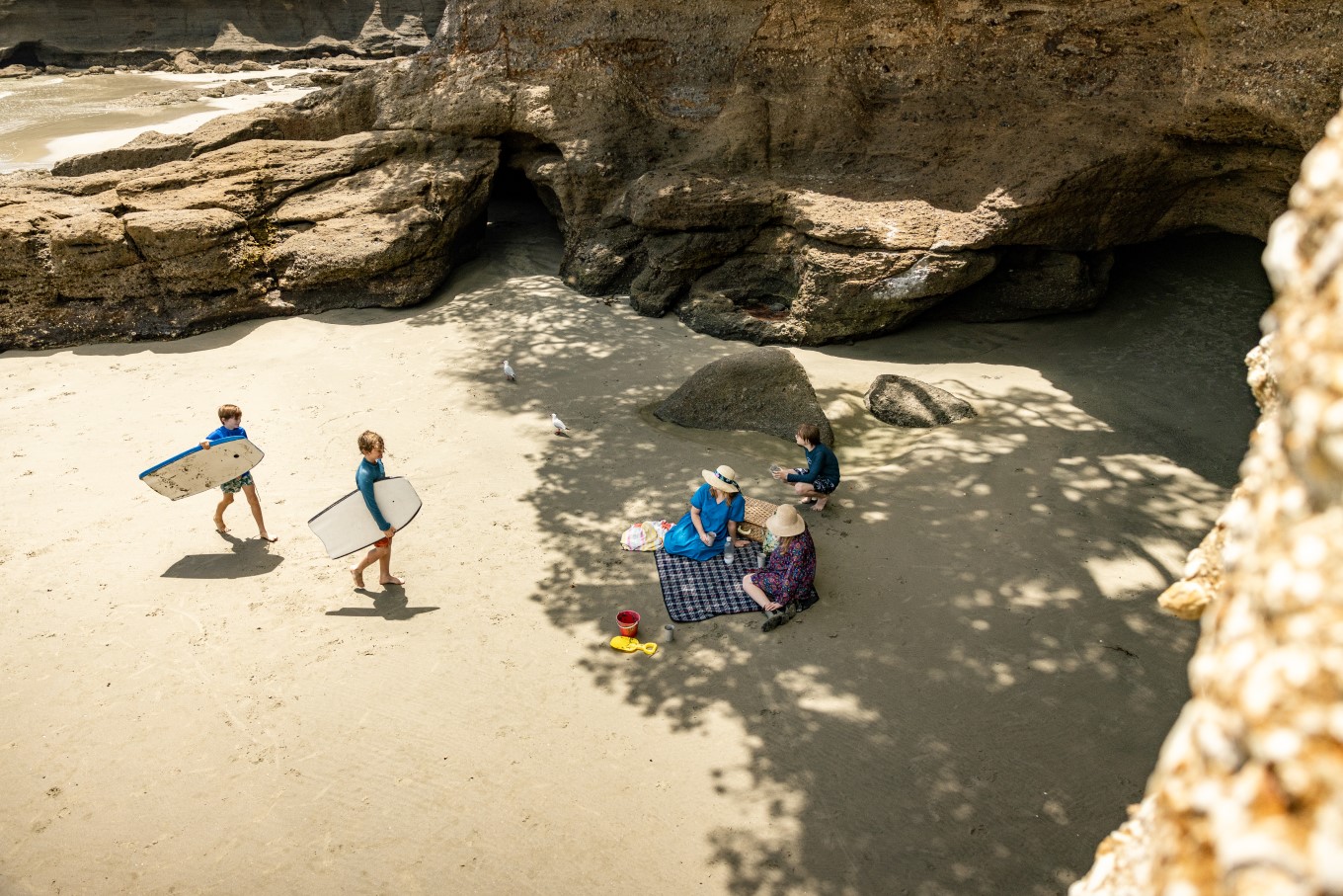 This historic coastal farm park overlooks the Firth of Thames and is about an hour’s drive from central Auckland. Swimmers here are treated to not one but two divine options for dips. Make a splash in the gentle surf at the pōhutukawa-edged beach, then wash the salt water off in the refreshing lagoon that runs into the sea.