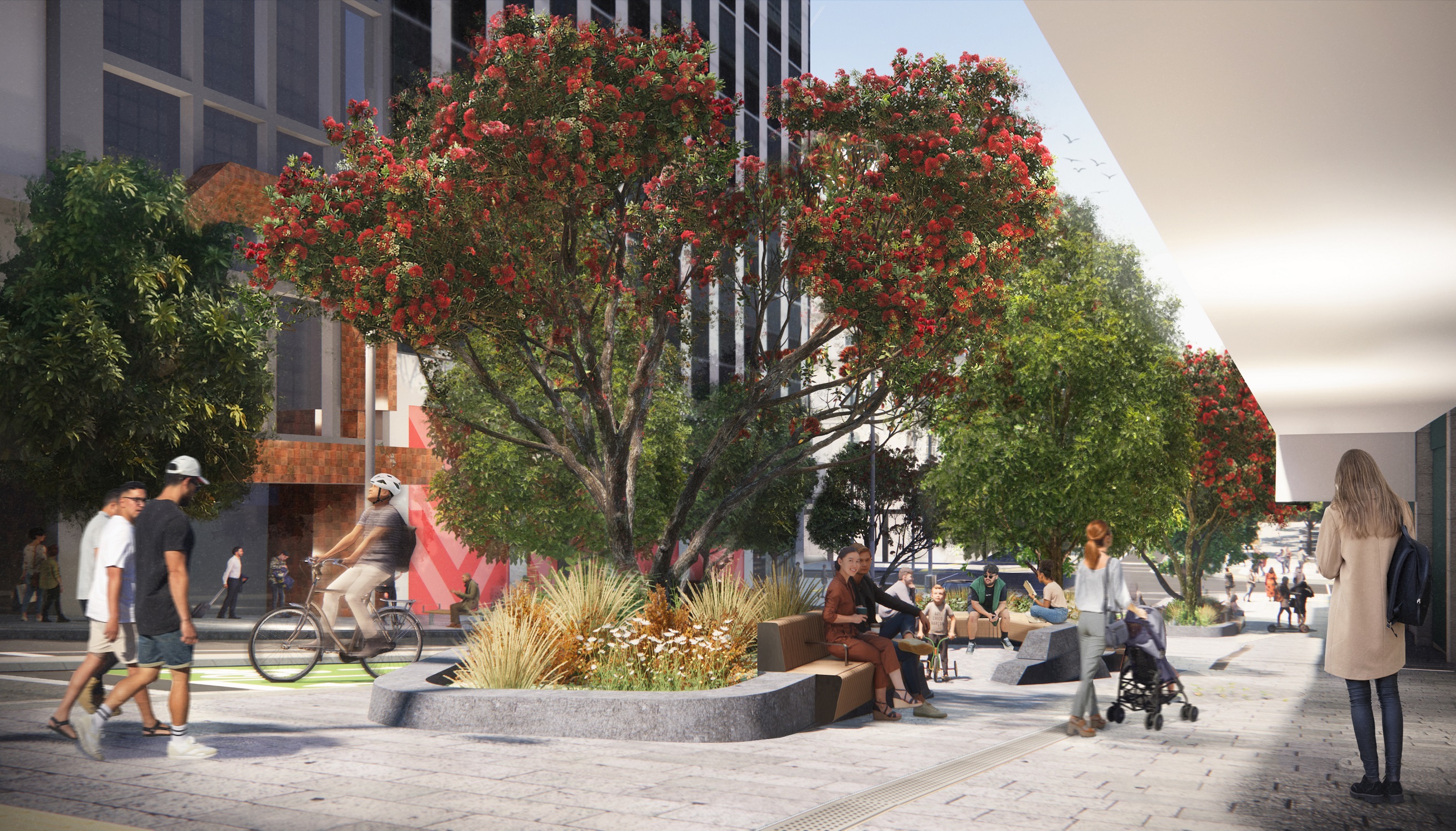 More than 20 native trees will be planted along the edges of Te Hā Noa, adding to the city centre’s expanding urban ngahere (forest), providing shade and shelter, cooling the city and soaking up carbon.