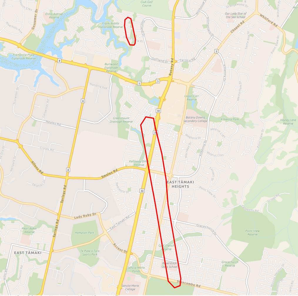 Map broadly showing the areas of east Auckland affected by Sunday night's tornado