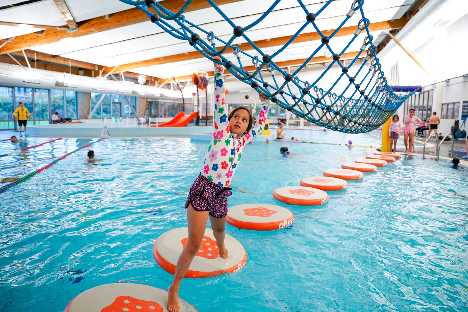 Kids will have a blast leaping across over-the-pool lily pads and scaling the climbing wall then plummeting into the water below with a splash. Younger tamariki will enjoy swooshing down the slide in the fun toddlers pool.