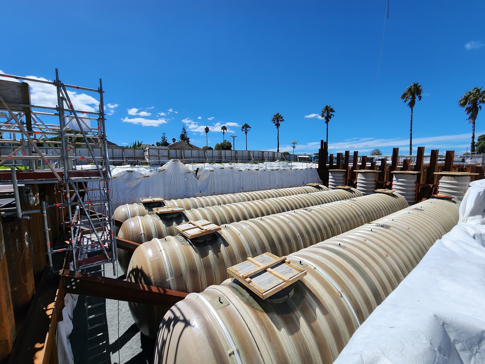 "Each of the 24-metre-long storage tanks weighed 5.3 tonnes each and had to be individually lifted in and placed six metres down into the underground structure to perfectly align with the manholes and inlet pipes managing flows received via the gravity main.