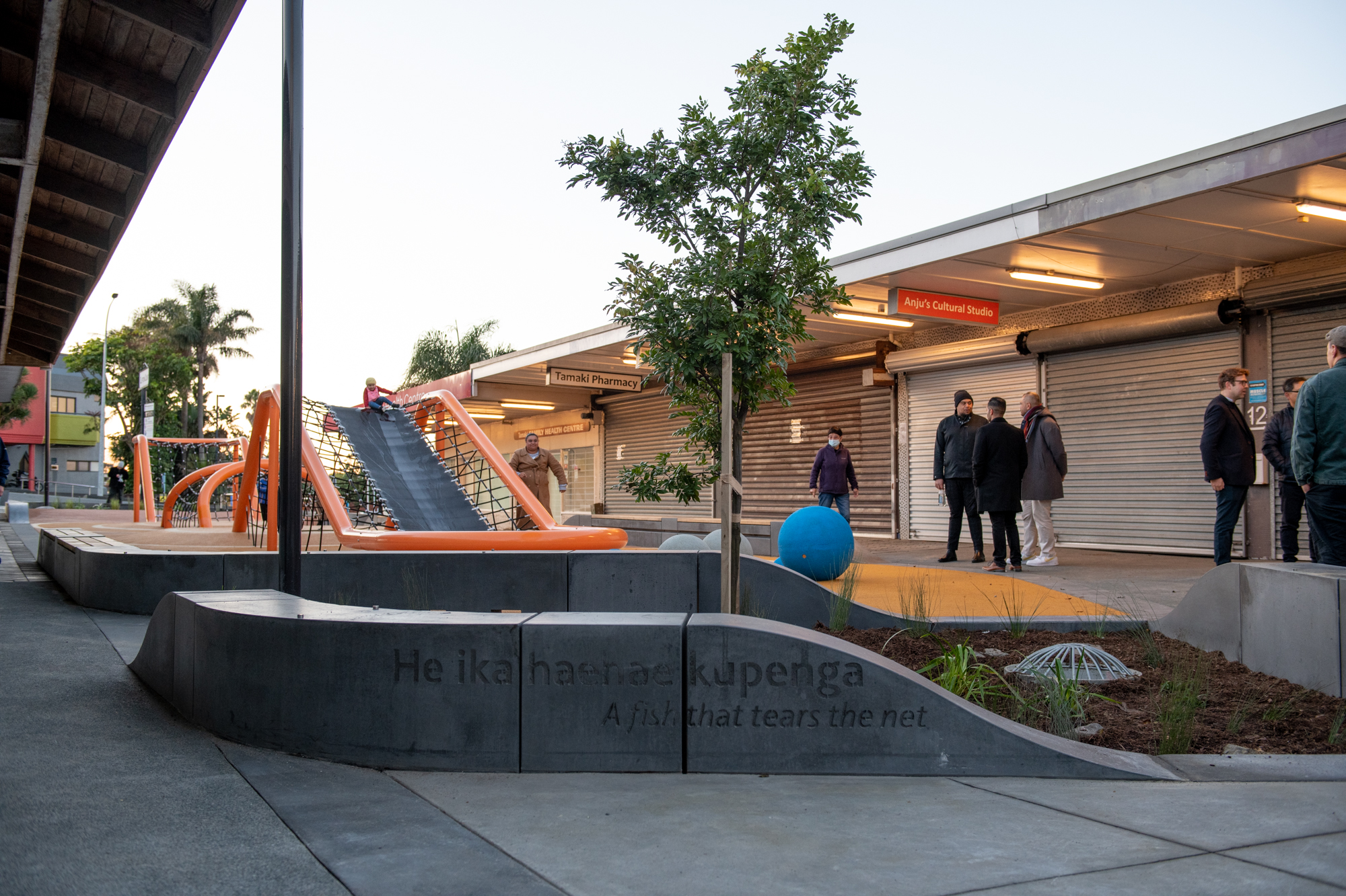 Sitting at the heart of the Panmure community, the revitalised area features a play space, plaza, laneway and courtyard, with planting and amenities such as seating, bicycle parking, outdoor activity space and lighting.