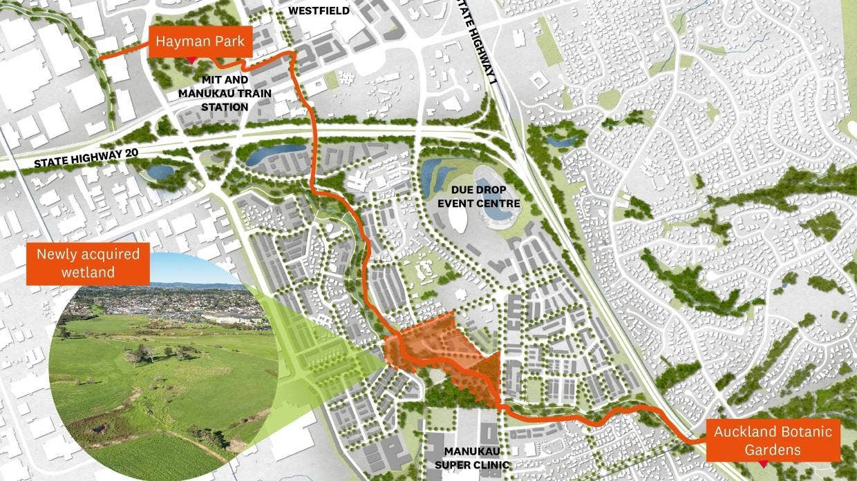 Te Aka Raataa will see the development of the future wetland site done in stages during that five-year period, linking the previously inaccessible areas alongside the stream. Community feedback is already informing design plans which focus on upgrades to the Raataa Vine Stream Reserve, a narrow open space connecting to the Auckland Botanic Gardens via a motorway underpass to the east and Great South Road to the west.