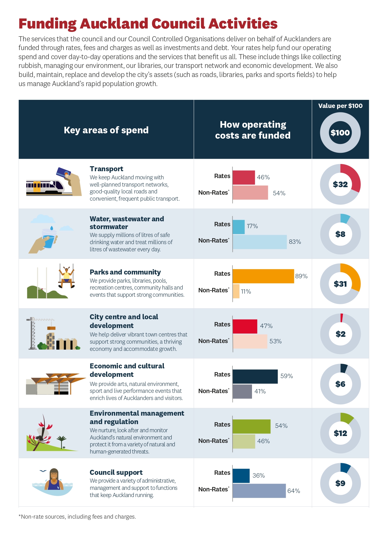 Aucklanders share access to all the services the council provides across Tāmaki Makaurau. Rates are not calculated by individual service, nor are they a fee for service. They fund all council activities not fully funded by other funding sources like fees and charges or central government funding.