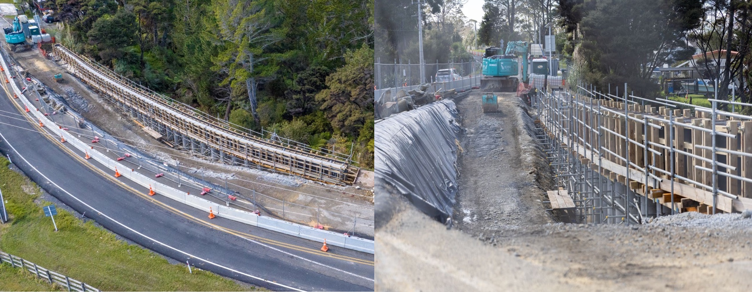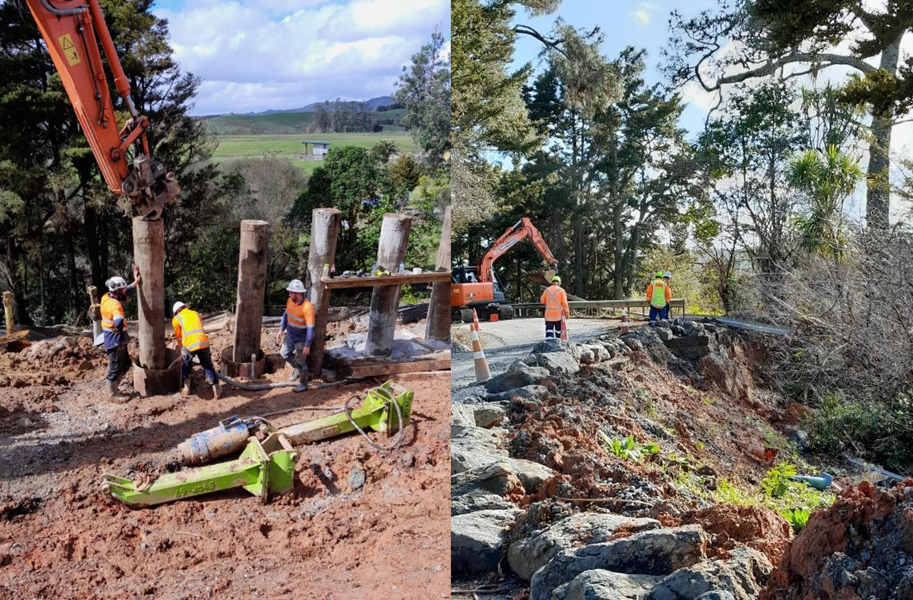 At Tauhoa Road, Tauhoa (west of Warkworth), piling works are underway to stabilise the roadway. This will involve an impressive 36-meter timber pile retaining wall, composed of a total of 24 poles.