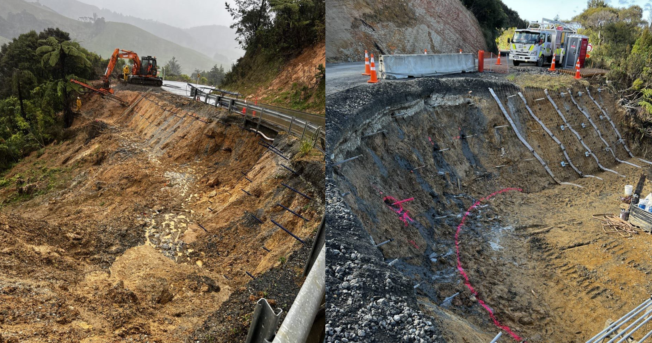 On Ahuroa Road, several major slips have completely closed the road through to Puhoi, two of which are shown above. The tiny settlement of Ahuroa now have an extra hour’s journey to connect back to Puhoi – previously just a few minutes. Progress to date includes soil nails (acting like anchors) ready for steel mesh and/or shotcrete (sprayed on concrete).