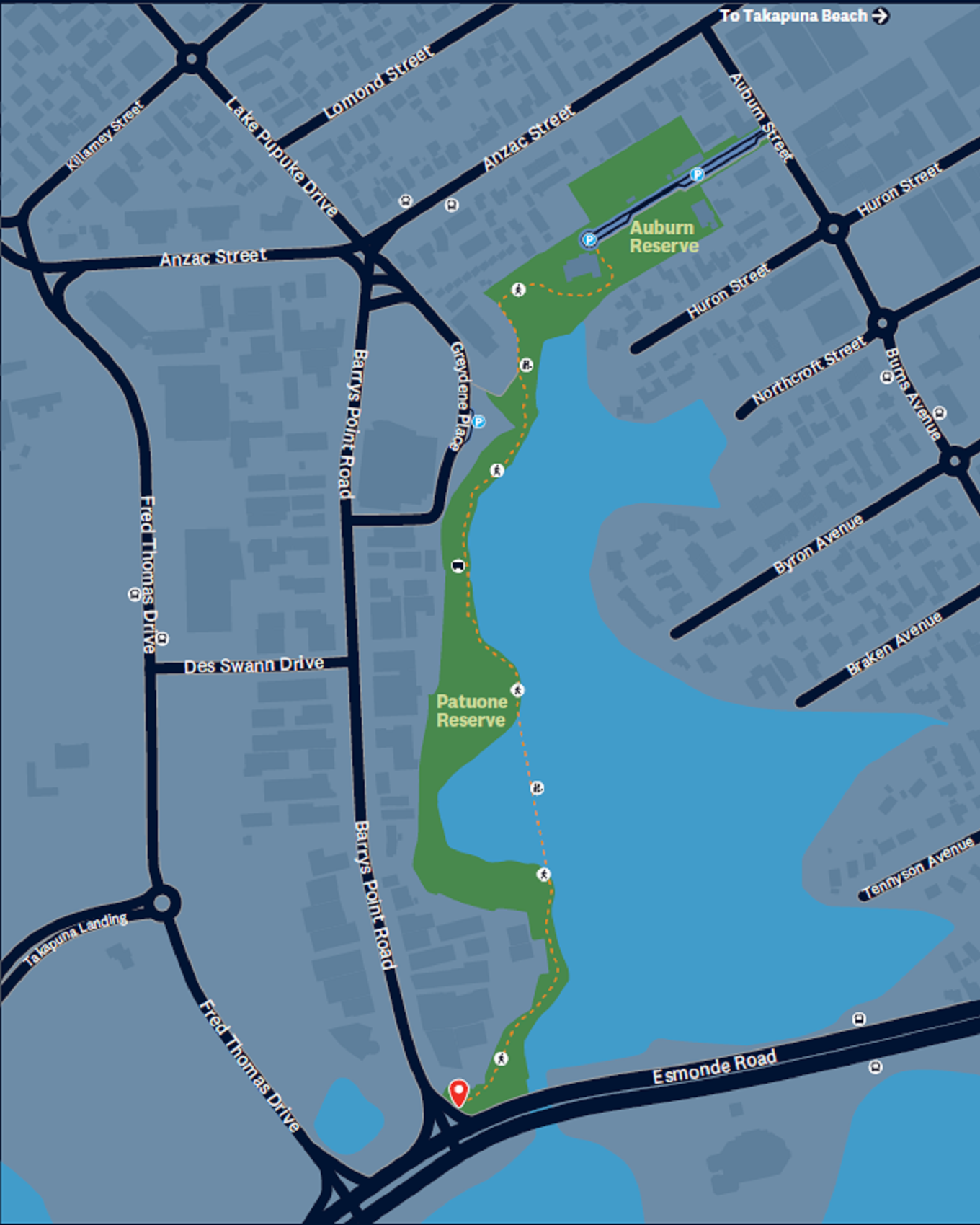 Travelling north from Esmonde Road, the path takes users along the edge of an estuary, through mangroves then up through native treeline to emerge in central Takapuna at Auburn Reserve. Users can also exit the path at Greydene Place behind the Takapuna Countdown.
