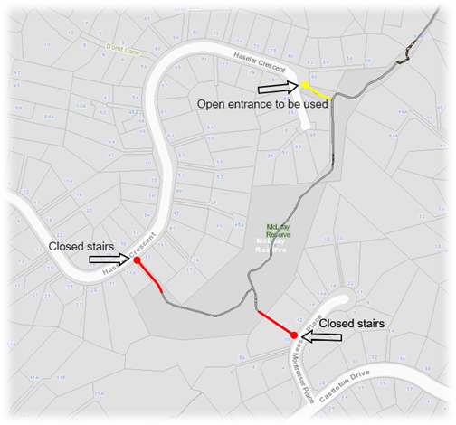 The stairs from Montressor Place and Haseler Crescent into McLeay Reserve have been closed off because of significant health and safety issues.