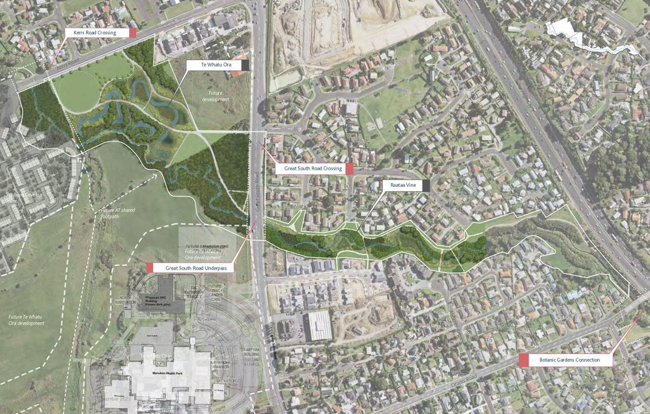 The project responds to the wider Te Whakaoranga o Te Puhinui programme by regenerating 1.1km of the Puhinui Stream to connect across the Raataa Vine Stream Reserve, which connects to the Auckland Botanic Gardens to the east and Great South Road to the west, and a newly acquired 7.6 hectare section of Te Whatu Ora’s Manukau Super Clinic.