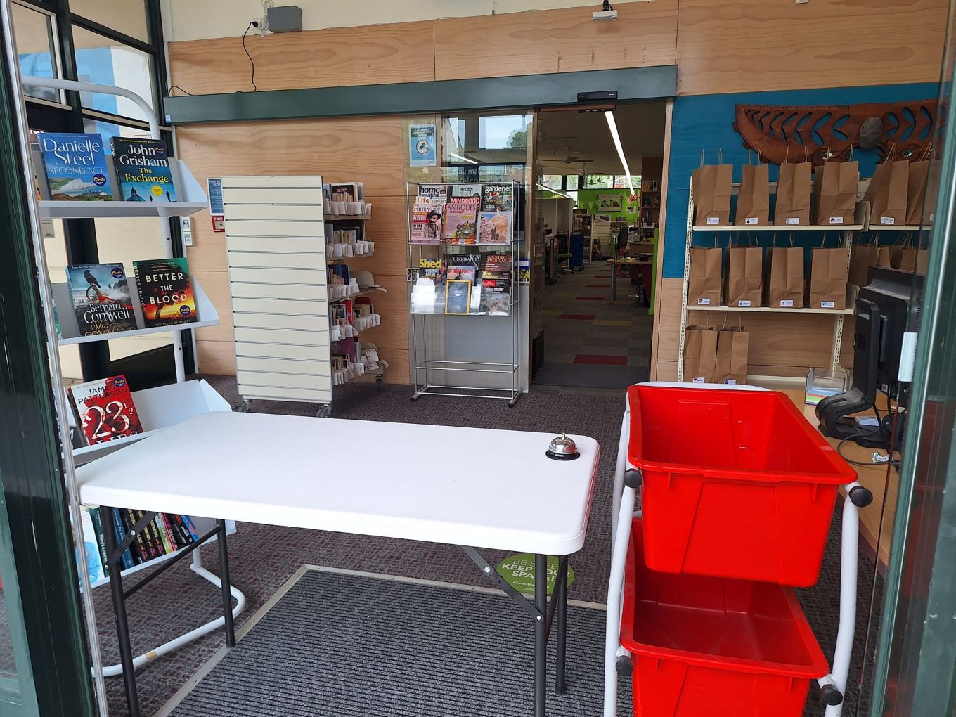 Helensville Library manager Sally Hardwick says customers can choose 'Take 5' lucky-dip bags and a click-and-collect service at the foyer throughout summer, along with printing, scanning services, and Wi-Fi.
