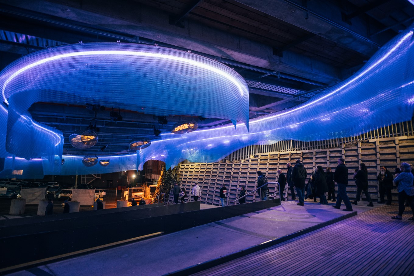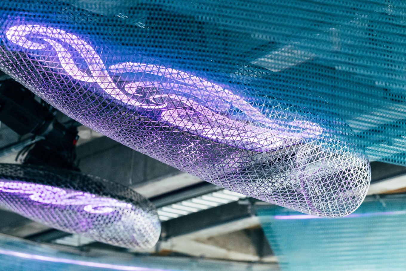 The Waimahara artwork’s open-weave fabric (Kaynemaile), suspended from the underpass overhead is designed to emulate water through colour, shape and movement. The Kaynemaile material is made from a renewable-energy (RE8) bio-circular polycarbonate material – a new generation ‘circular-economy’ plastic that is non-fossil-fuel derived and 100% renewable. Developed by New Zealander - Kayne Horsham - as light-weight chain mail armour for the actors during the making of Sir Peter Jackson’s Lord of the Rings trilogy, Kaynemaile has become a patented architectural material and world-leading innovation.