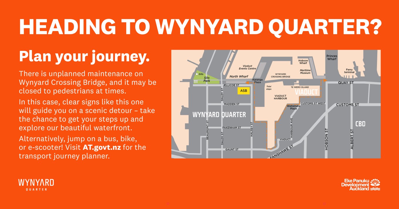 Current update for the Wynyard Crossing Bridge – an alternative solution is currently being tested, while works continue on repairing the core technical fault. Please use the detour options.