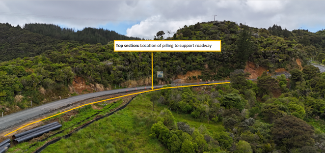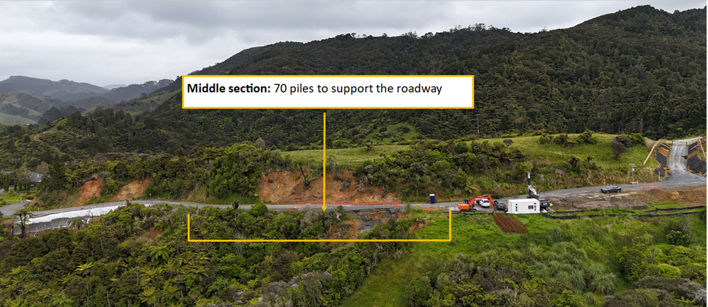 Work kicked off again toward the end of last year and Downer NZ is now installing piles on the southern top side of the hill to reinforce and stabilise the road.