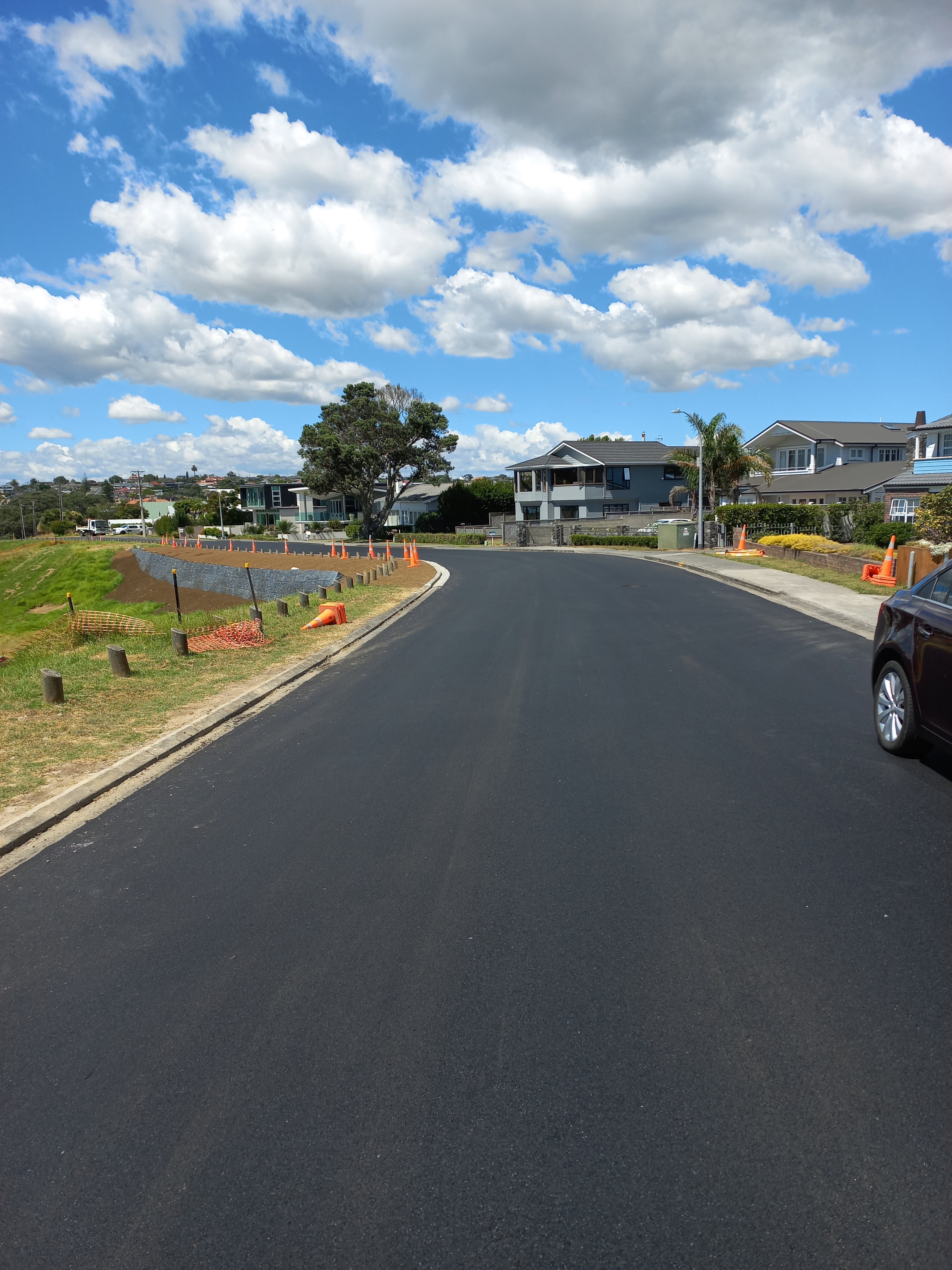 Work started early December, and the 60m long retaining wall was completed before Christmas. In the New Year, AT contractors relocated the stormwater pipe, installed kerb and channel, planted vegetation, laid pavement, resurfaced the road, and put down line marking.