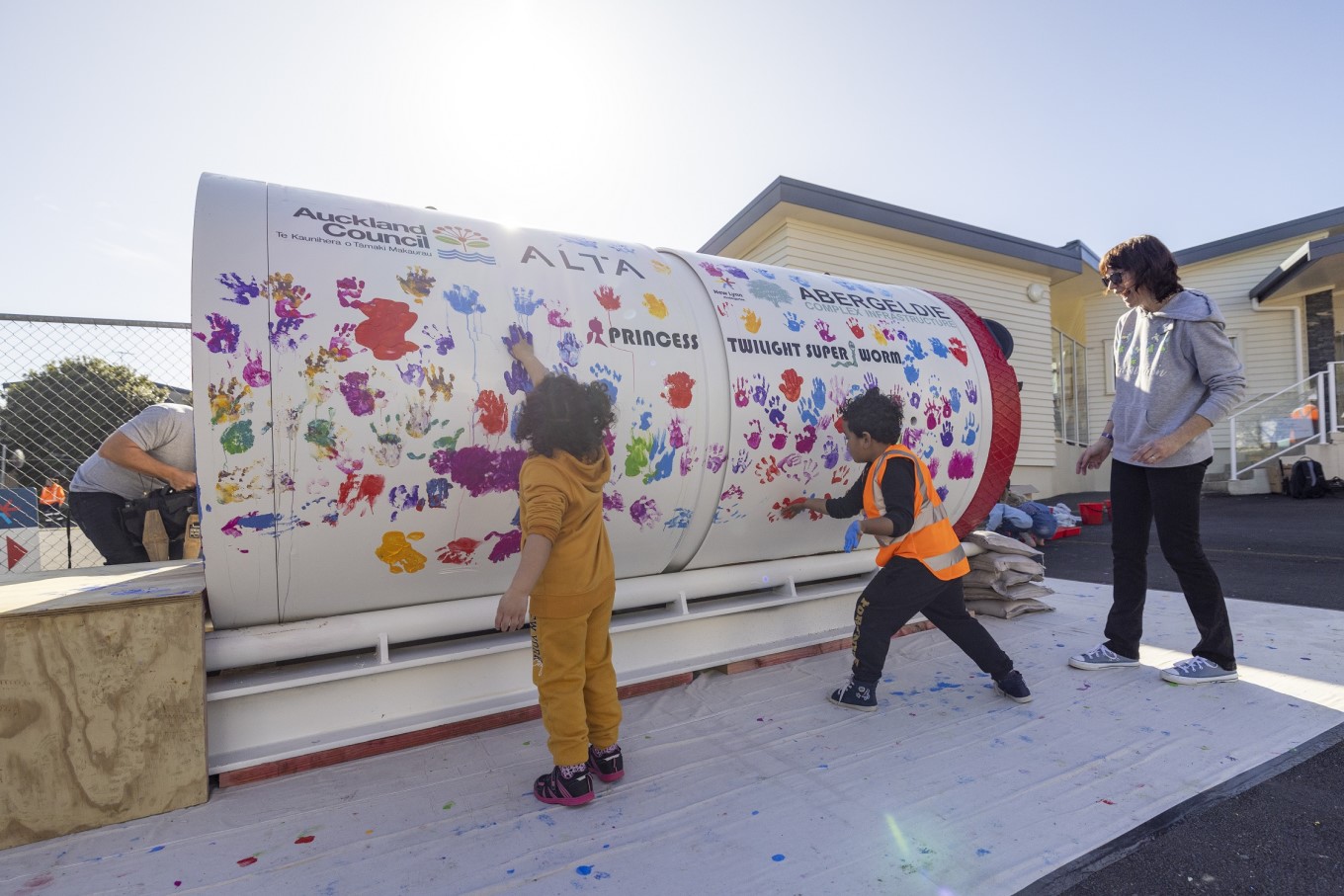 The children of New Lynn Kindergarten were asked to wish the tunnel boring machine well, applying their painted hand-prints to its surface and giving it a special name which made the 6 o’clock news.