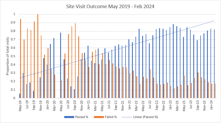 Since 1 July 2023, 80 percent of first site visits passed inspection (1519) while 20 per cent were issued either abatement and/or infringement notices (383).