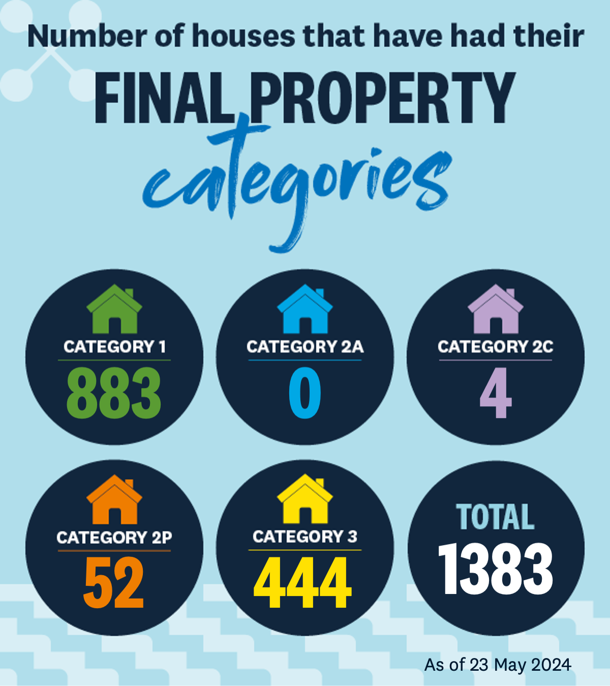 A total of 1383 homes have received a final property categorisation with 444 classed as Category 3 and eligible for a buy-out (as of 23 May).