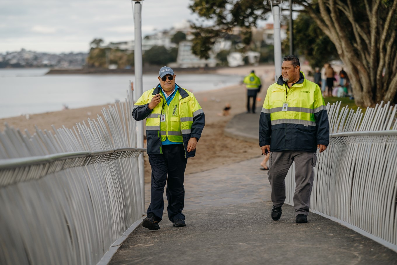 Pastor Richard Takapautolo cuts a powerful figure while patrolling Selwyn Reserve in Mission Bay. As children play near the fountain and picnickers enjoy ice creams in the popular seaside spot, Richard and the other volunteer members of the Maungakiekie-Tāmaki Pacific Wardens stand strong, looking out for trouble.