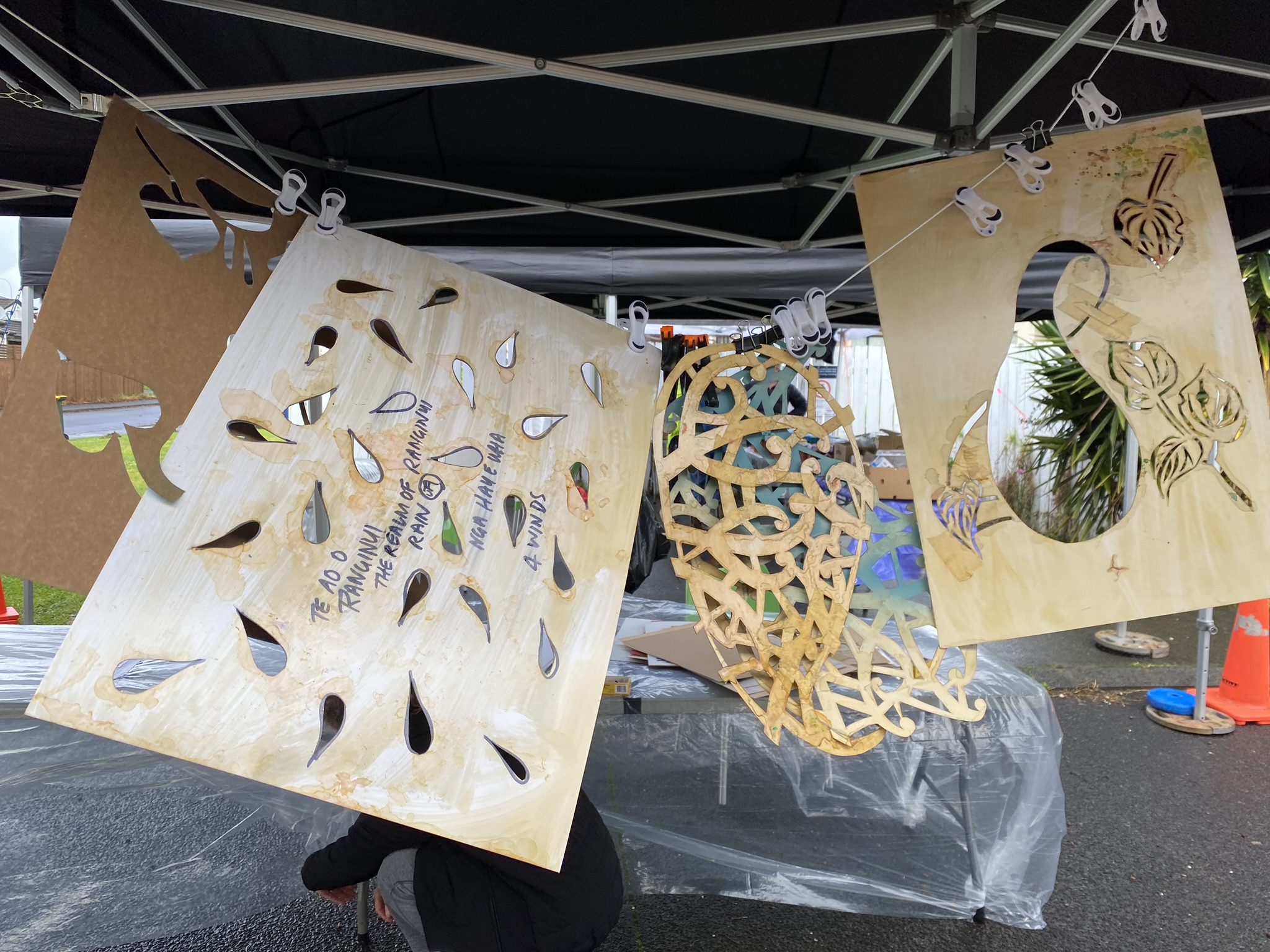 Charlotte created an extensive range of stencils, all chosen for specific reasons: Kererū (wood pigeon) for peace, raindrops to cleanse, bees and hexagons to neutralise, and hearts – “because the kids wanted hearts”.
