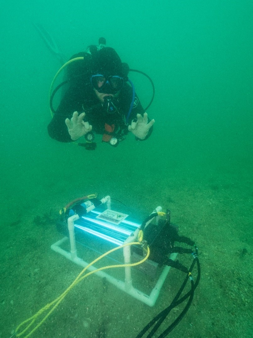 University of Auckland diver attending to UV-C lamp in operation treating Caulerpa parvifolia on the seabed at Māori Garden Bay, Rakino Island. The three parallel UV-C lamps are powered from the surface (black cables) with a white plastic frame holding the lamps above the seafloor to ensure adequate light coverage.