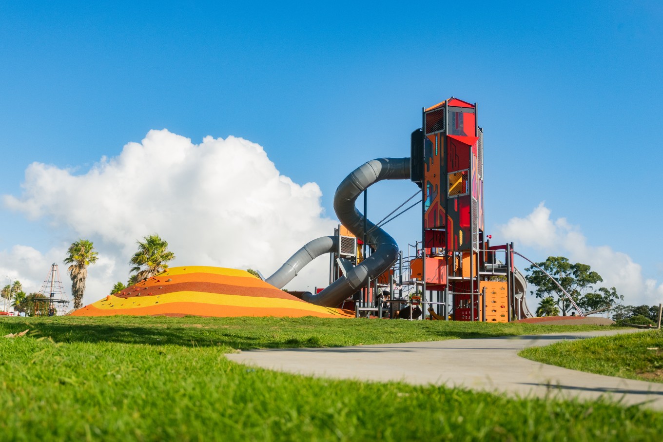 David Lange Park in Māngere is colourful and packed with activities for kids of all ages, including a playground with a flying fox, a skate park, and courts for basketball, volleyball and netball.