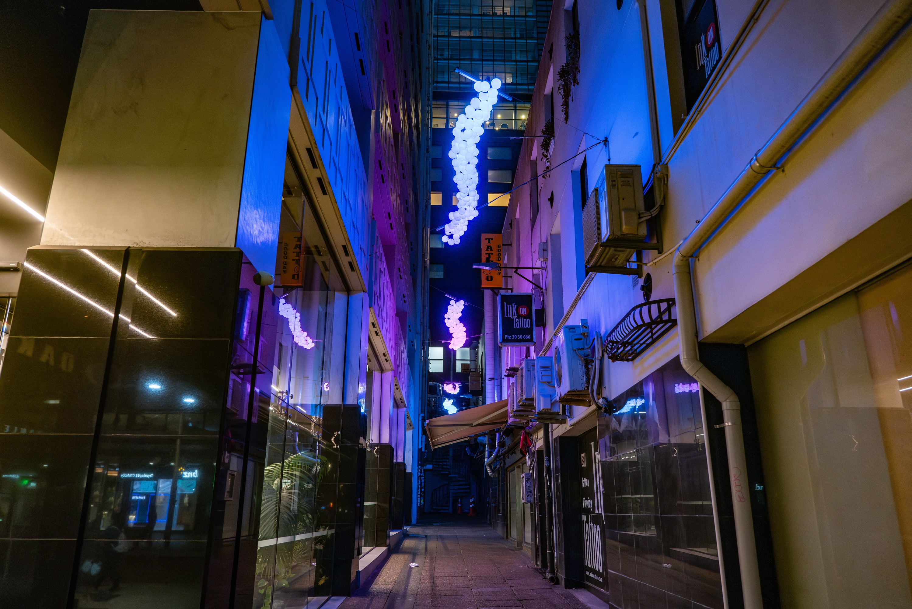 Lighting installations: Te Ha o Hine Place, Freyberg Place, Deloitte’s Building, Viaduct, Darby St lampposts, Aotea Square, Exchange Lane